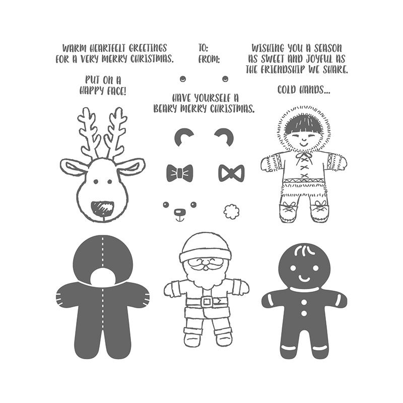 This fun treat topper uses the gingerbread image and a sentiment from the Yummy Little Christmas set (retired), but you could use another set for the words. The gusseted cello bag holds a Gingerbread Peep, a mini Hershey Bar and a couple Graham Crackers for a DIY s'mores kit.